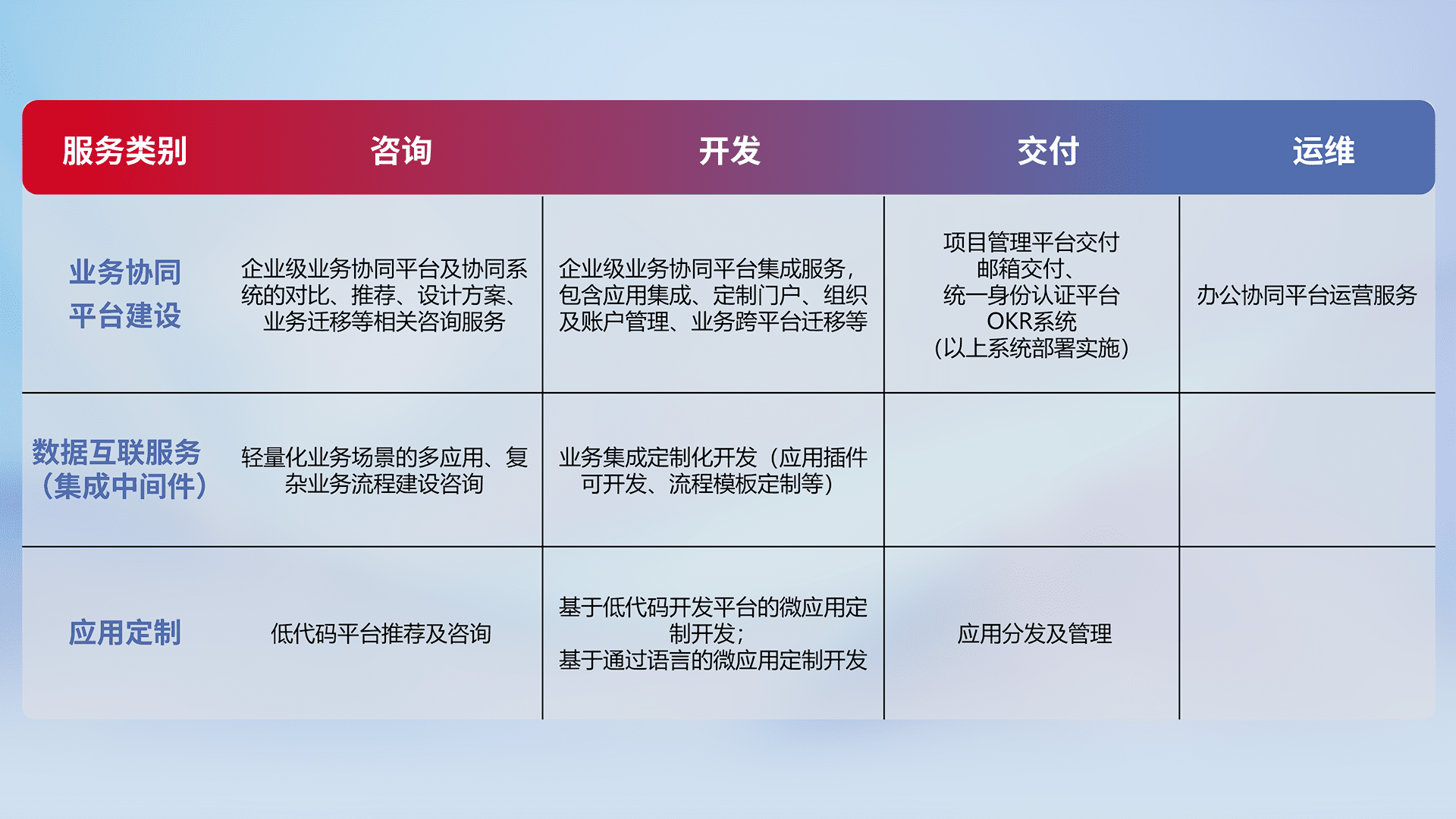 针对钉钉、、、、企微、、、IDaas等平台级产品提供产品的规划、、、方案、、、、交付、、、定制化开发等服务,,,,实现如统一协同办公、、、、智能客户服务、、混合会议管理、、、智能数据查询、、等业务场景,,,,实现数字化转型。。